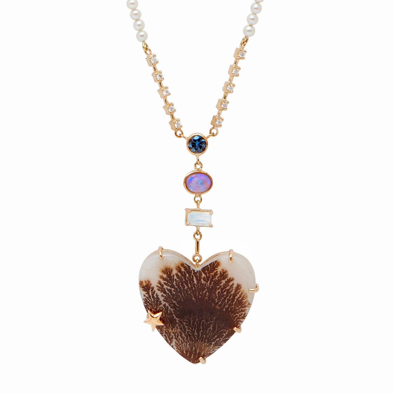 • From the whimsical Fairydusted Collection, the Titania Heart Necklace embodies a playful elegance and a curated sense of charm. Featuring a heart-shaped agate at its center, the necklace is adorned with a magical scattering of moonstones (.62 cts), opals (17 cts), iolite (.23 cts), sapphires, pearls, and a sparkling diamond (.11 cts). Set on an adjustable 18k gold chain, it can be worn at lengths from 17" to 21".