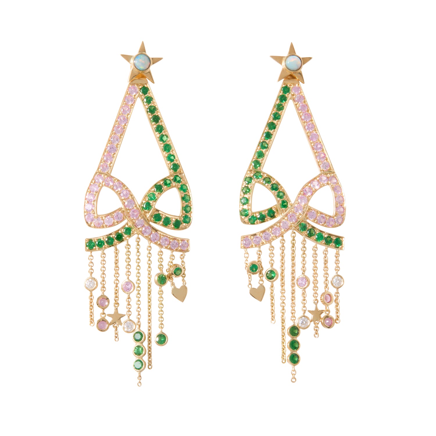• Sapphire Xiao Earrings by Unhada - These earrings channel the magic of twilight with their celestial glow. Crafted in 18k yellow gold, twinkling pavé blue sapphires form shimmering stars, each centered by a rich cabochon sapphire. Below, an 18k gold crescent moon sparkles with pavé diamonds, framed by cascading chains that move with subtle grace. Finished with 18k gold ear wires, this enchanting design captures the wonder of the night sky in every detail.