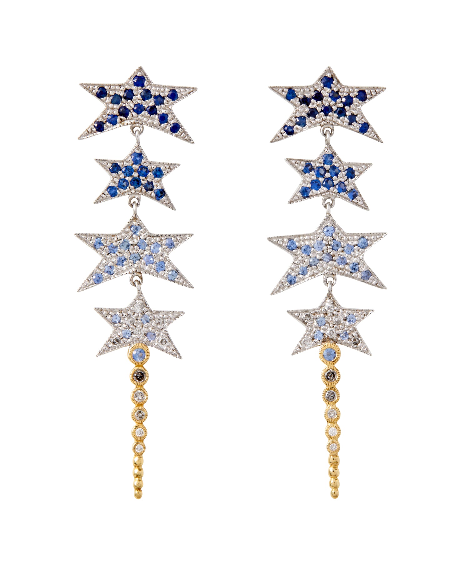 • Starplay Earrings by Unhada - Reach for the stars with these bold statement earrings. A captivating linear design features a cascade of stylized stars, each sterling silver star adorned with shimmering ombre blue sapphires (1.06 cts). The design tapers down gracefully, ending with a line of graduated bezel-set sapphires and diamonds (.23 cts) in radiant 18k yellow gold, creating a stunning contrast that catches the light from every angle. At a bold 2 inches in length, these earrings are secured with post ba