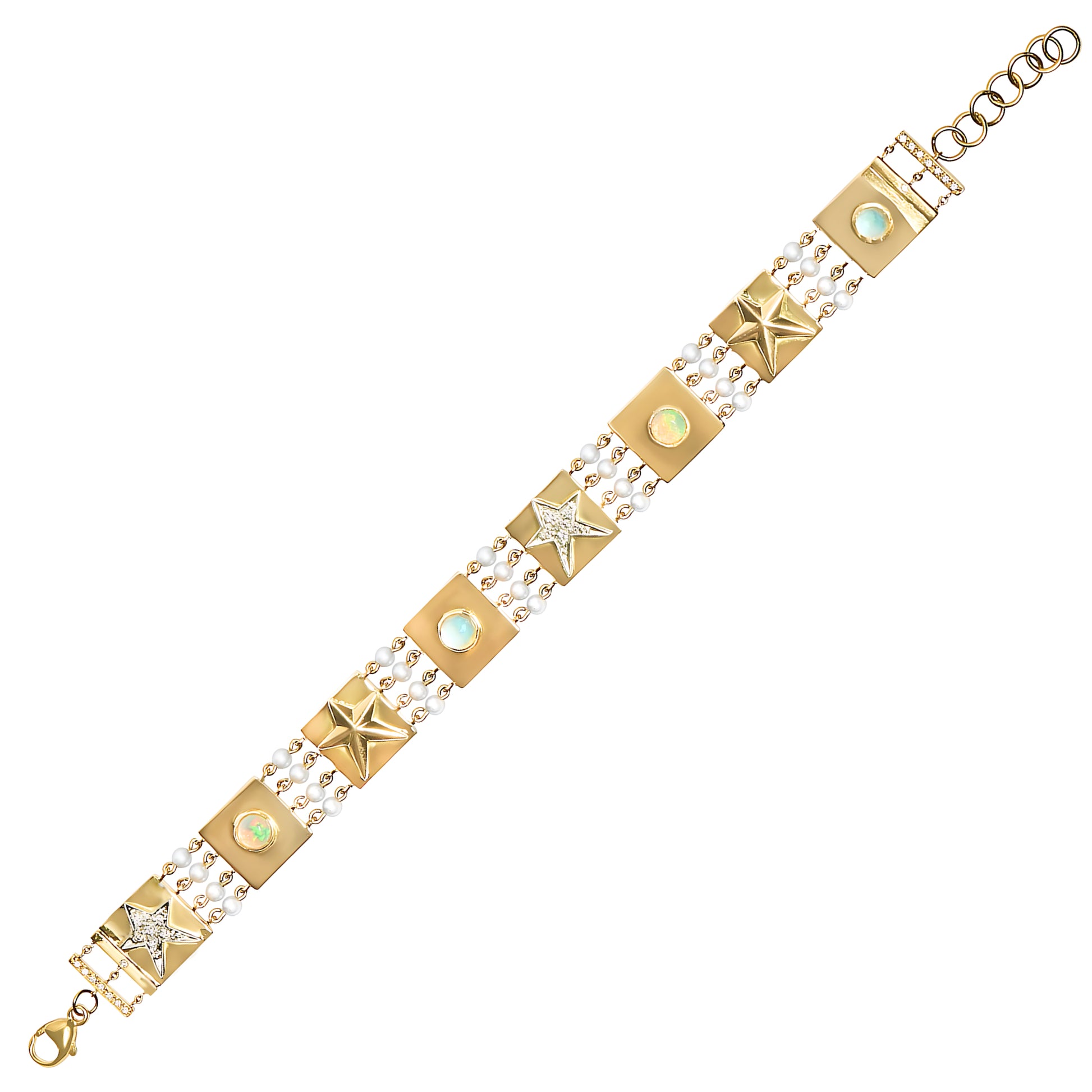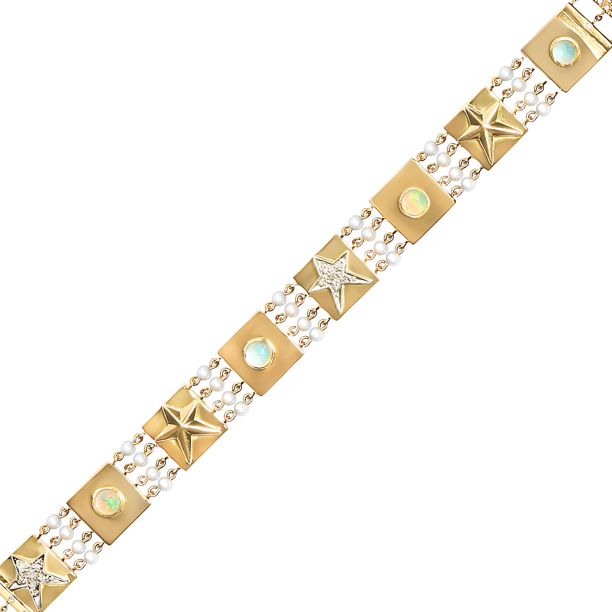 A future heirloom, the one-of-a-kind Capture Bracelet is a testament to extraordinary design and excellent craftsmanship. Strands of luminous pearls frame a series of 18k gold tiles, each adorned with intricate details: pavé diamond stars (.09 cts), glowing opals, serene aquamarines, and sculpted convex stars.
