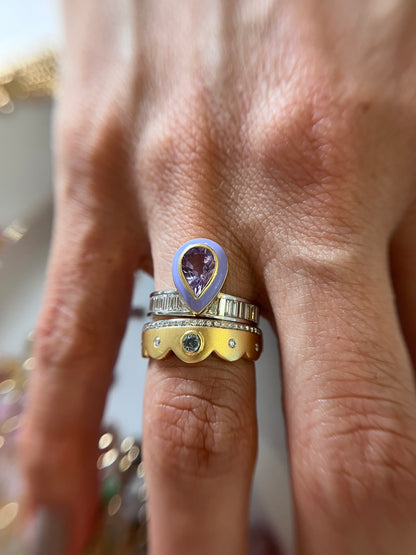The Chantal Ring showcases feminine elegance through thoughtful design and precious materials. This 18k gold aquamarine ring features a distinctive scalloped setting that cradles a tranquil aquamarine (.27 cts) surrounded by sparkling diamonds (.12 cts), creating a piece that's perfectly lovely on its own or elegant as a ring stack topper.