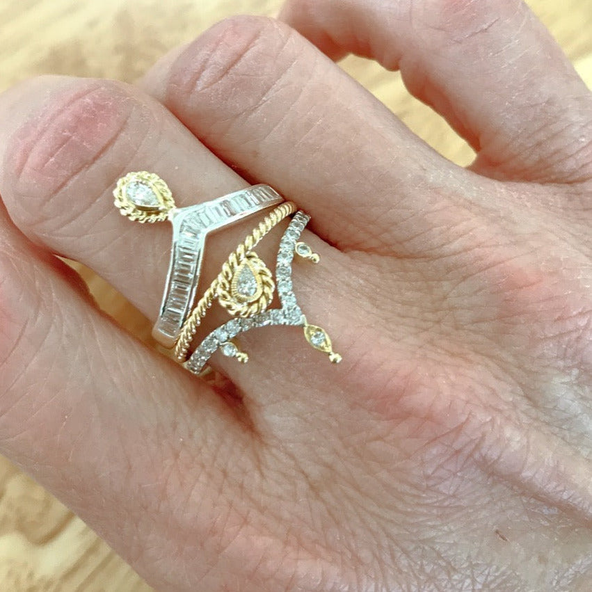 The Diamond Purity Ring features 18k gold twisted cable design gracefully embracing a pear-cut diamond (.05 ct). This stackable gold diamond ring offers refined elegance whether worn solo or as part of a curated ring collection, with sea-inspired details from UNHADA's Moonceros Collection.