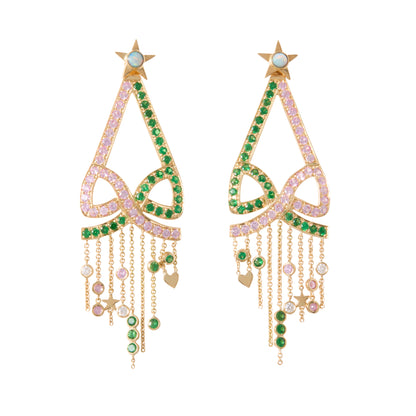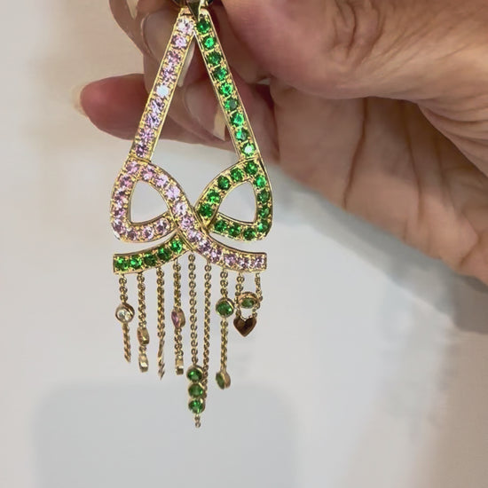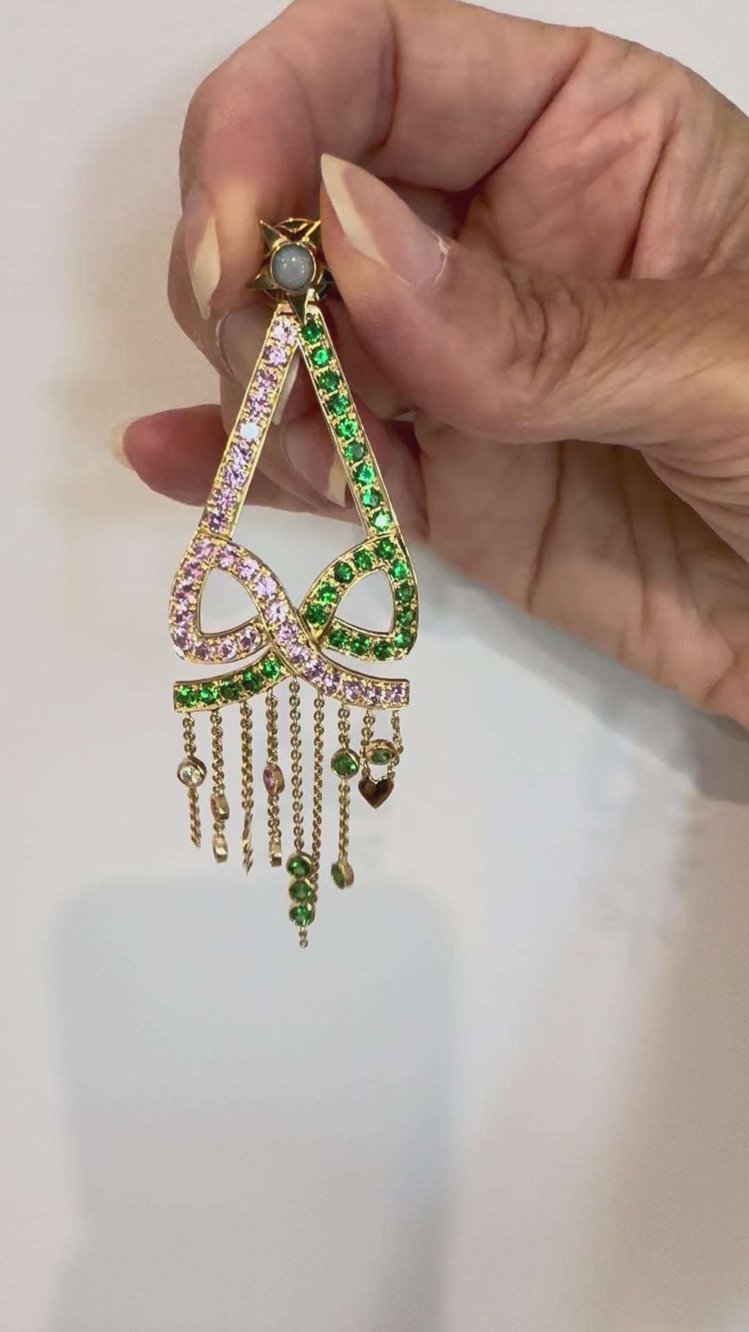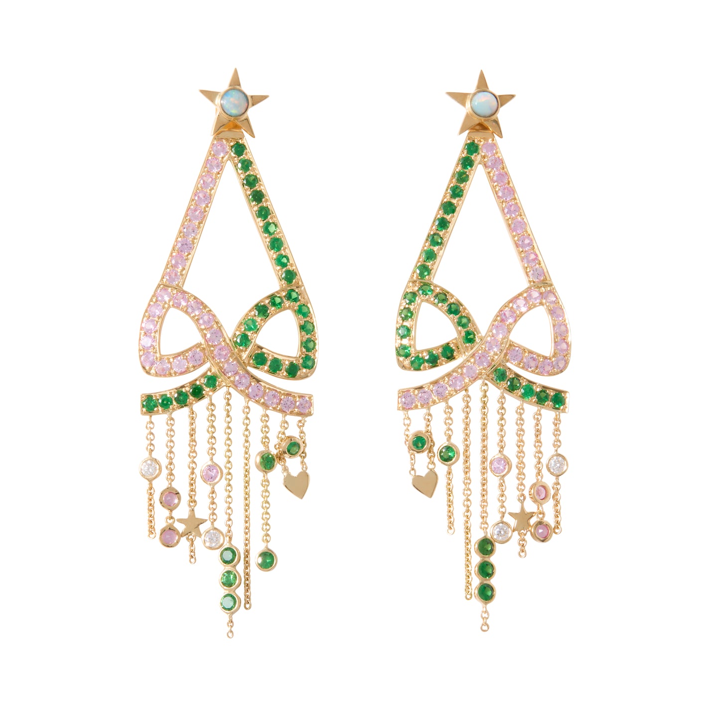 Discover the one-of-a-kind English Rose Earrings, a transformative 18k gold statement earring that represents extraordinary craftsmanship and color. These detachable drop earrings offer incredible versatility—wear the star opal studs solo or attach the shimmering bow chandelier drops for dramatic impact, creating two distinct looks in one exceptional piece.