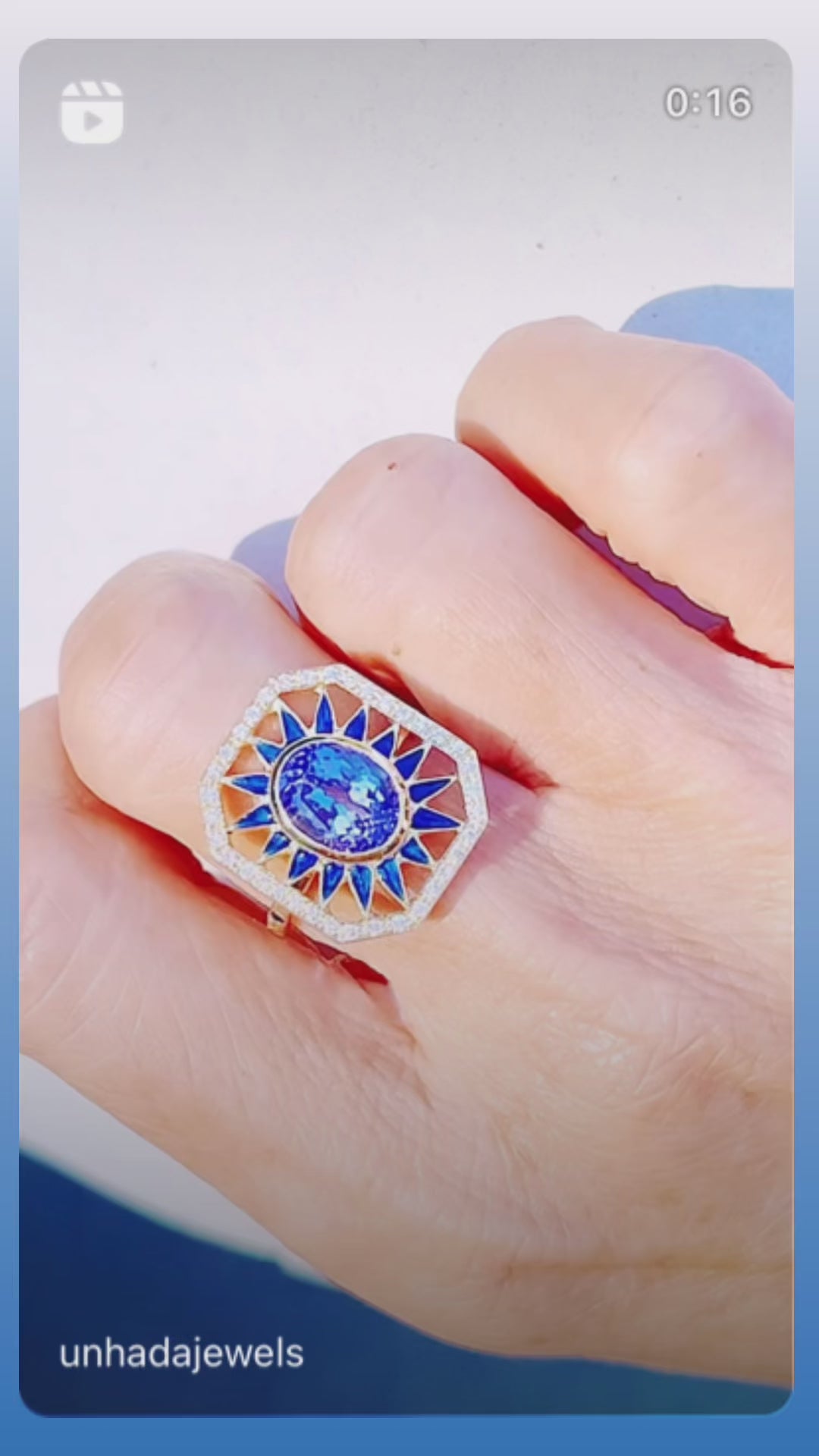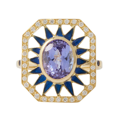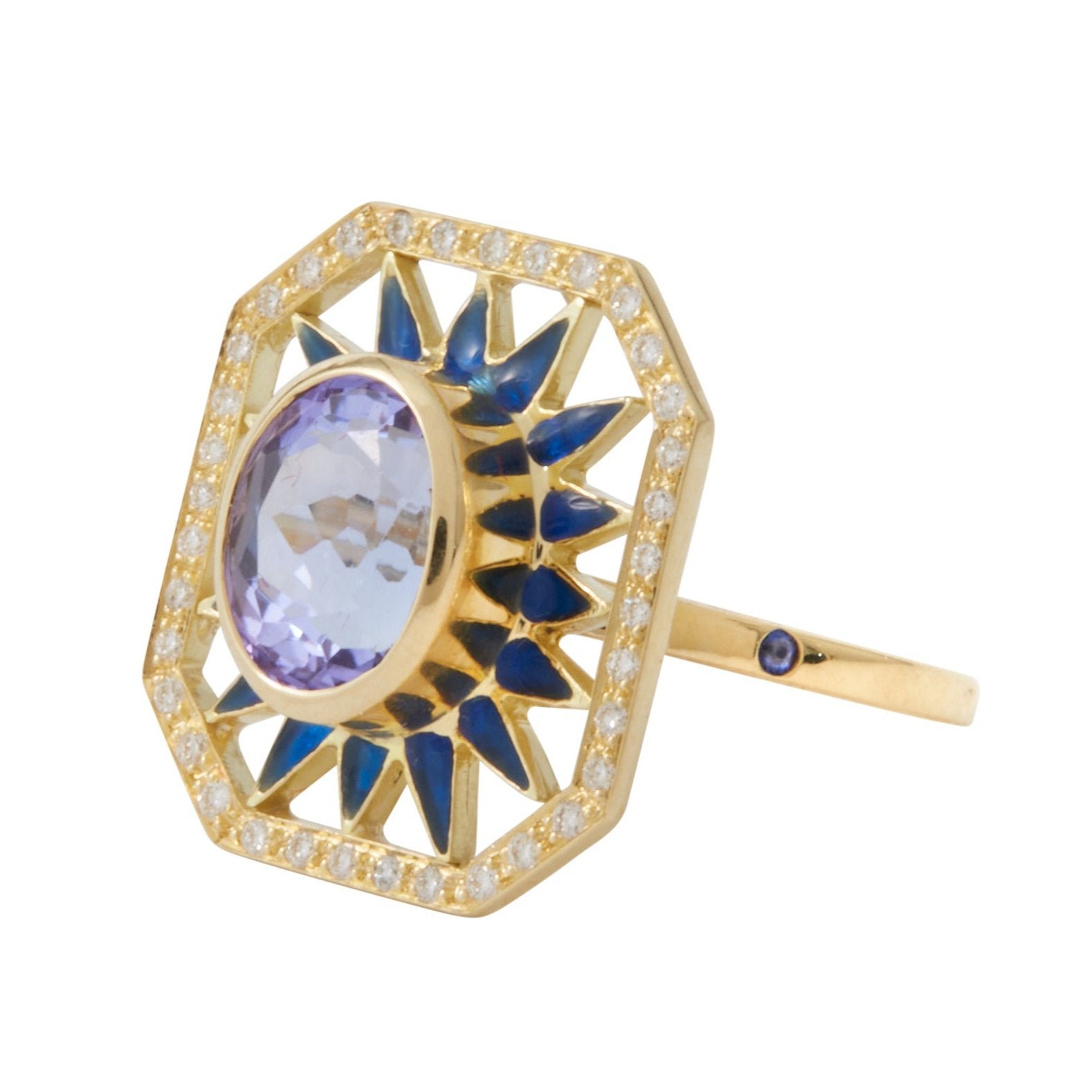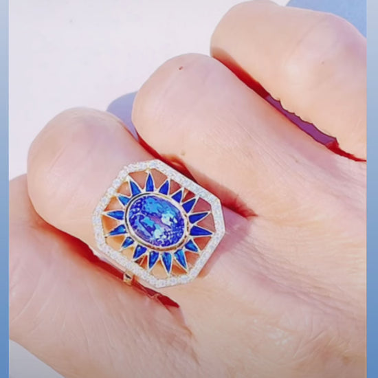 Experience the one-of-a-kind Fate Ring, a stunning 18k gold Art Deco tanzanite ring that pays dazzling tribute to vintage design excellence. This tanzanite statement ring showcases a magnificent oval-cut tanzanite (2.56 cts) set against a rich blue enamel starburst, framed by brilliant diamonds in a stunning blend of vintage inspiration and modern craftsmanship.