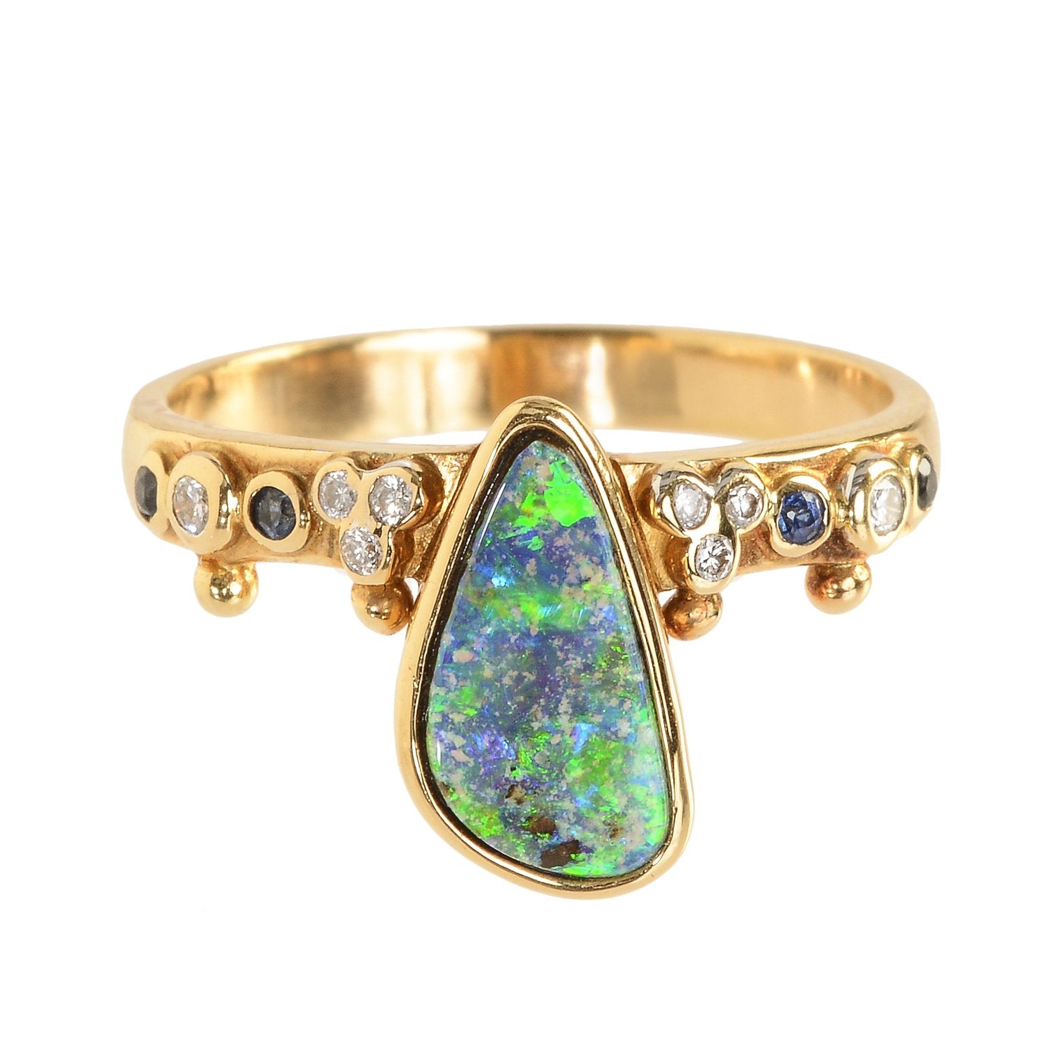UNHADA's bestselling First Knight Ring showcases Australian boulder opal paired with emeralds (.07 cts), sapphires (.07 cts), and diamonds (.09 cts) in 18k gold. This one-of-a-kind boulder opal ring is designed for stacking to create a multitude of visual statements, making it the perfect foundation piece for curated ring collections.
