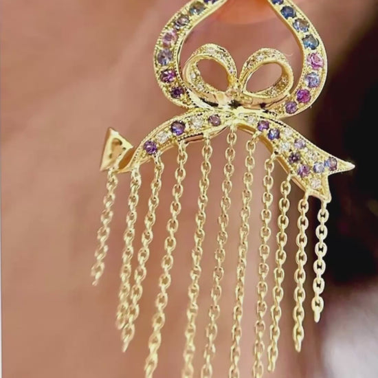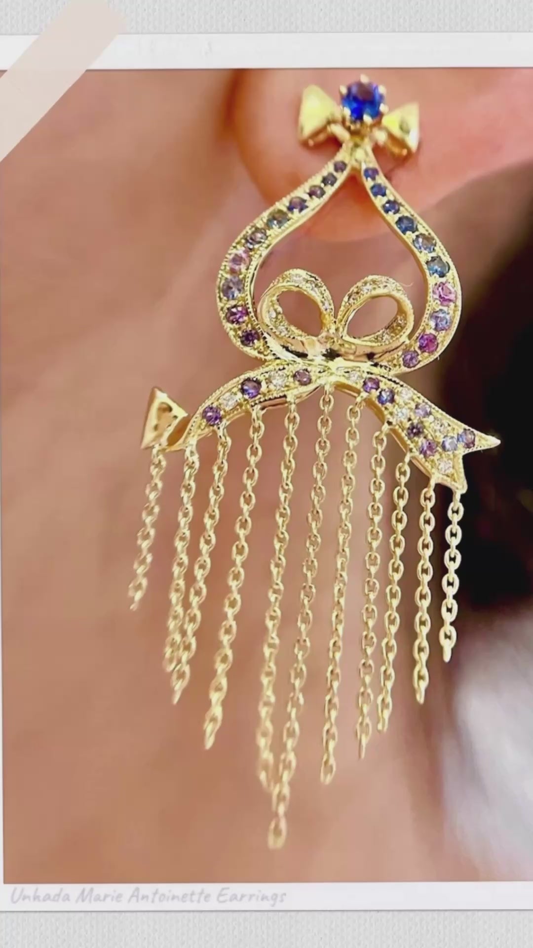 Experience the one-of-a-kind Marie Antoinette Earrings, convertible 18k gold sapphire earrings that transform from regal statement pieces to minimal elegance. These hand-fabricated bow jacket earrings feature removable bow jackets adorned with ombré sapphires (1.25 cts) and diamonds (.20 cts), offering sophisticated versatility in one exceptional design.