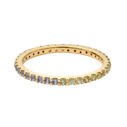 This Ottoman Band eternity ring reimagines the classic with a striking ombré of green and purple gems, blending 0.30cts of green sapphires and 0.28cts of purple sapphires in 18k gold. A colorful alternative to the traditional diamond band, it stuns as an unconventional wedding band or stacked for a pop of color.