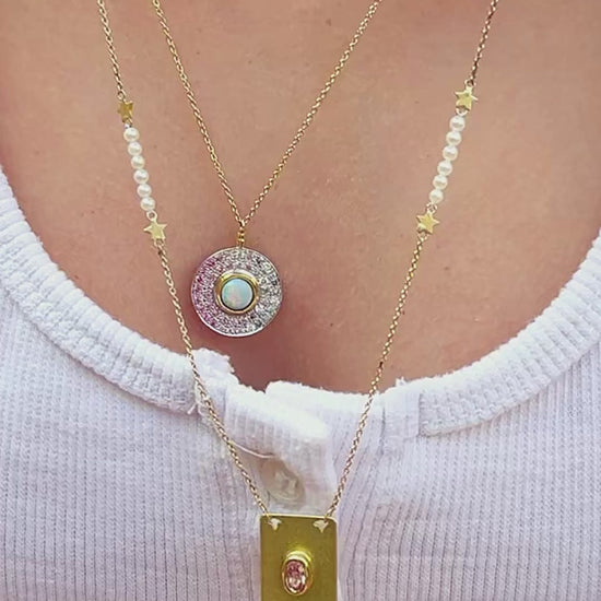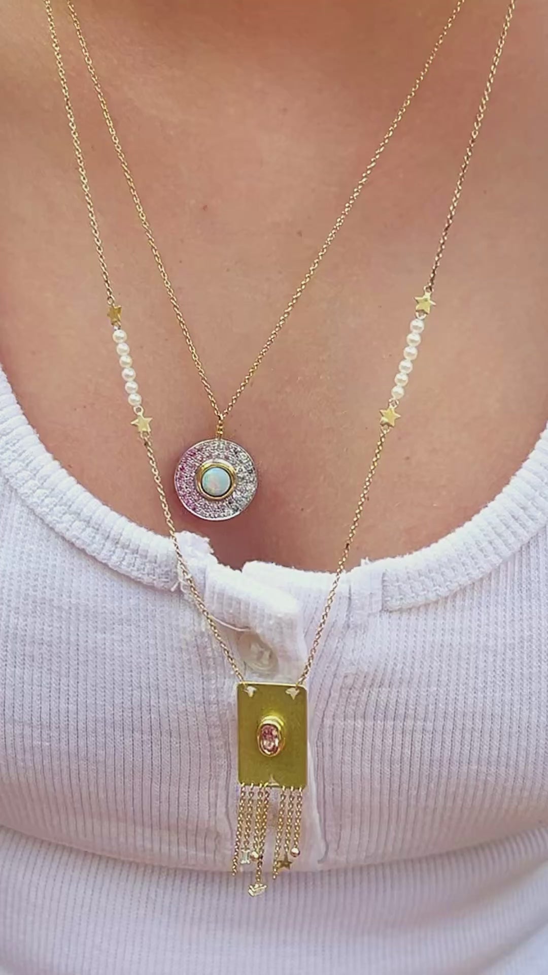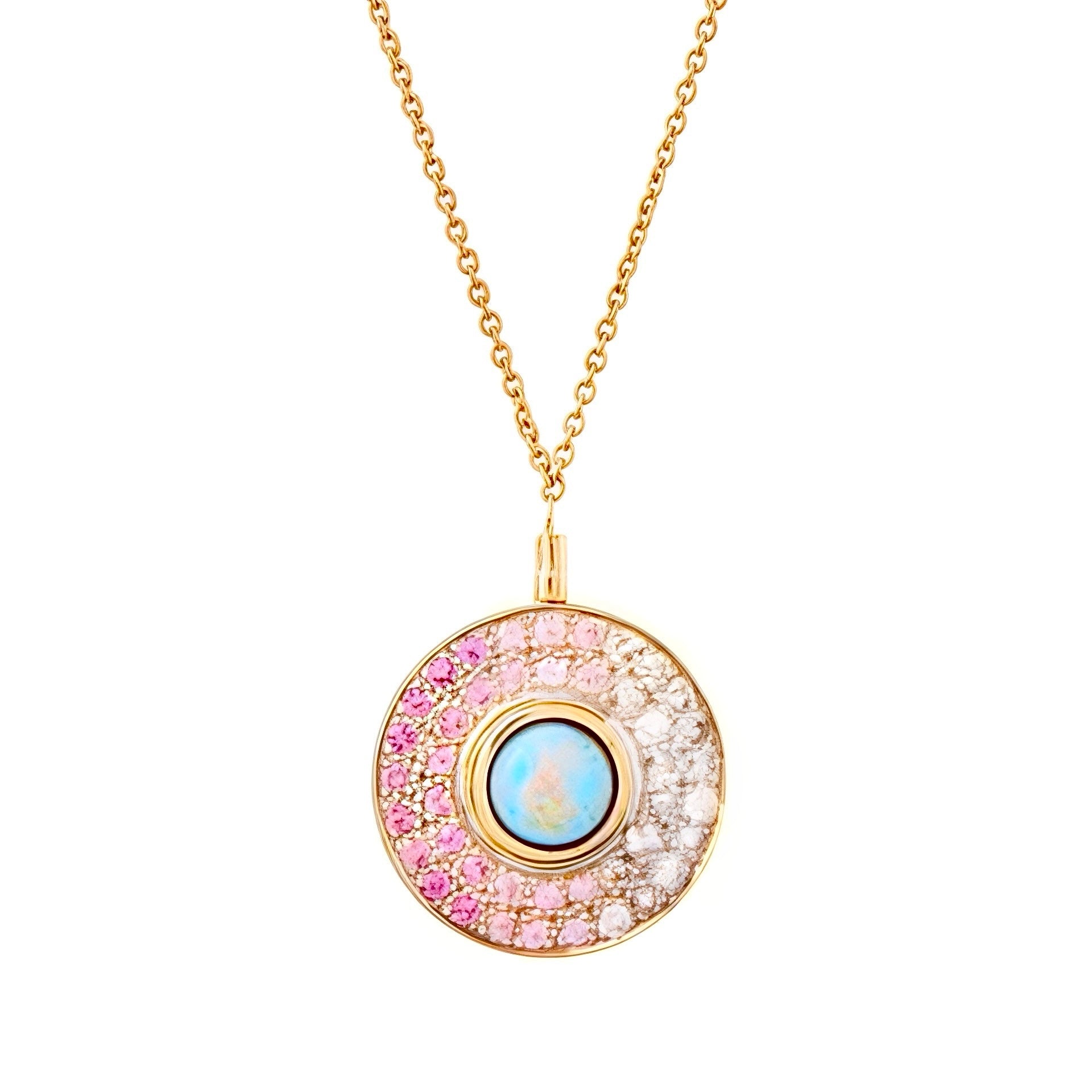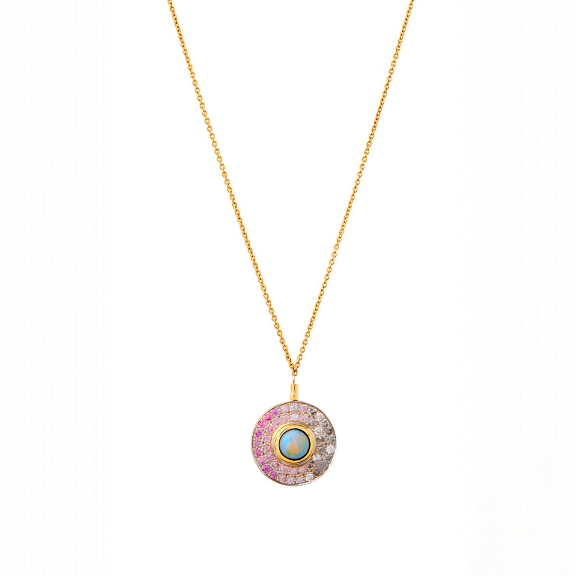 The Pink Sapphire Mirror Necklace is the epitome of soft radiance, blending color and light with effortless grace. At its center, an Australian opal reflects shifting hues, surrounded by pavé-ombré pink sapphires (.43 cts) and diamonds (.24 cts) that deepen and fade, reminiscent of watercolor.