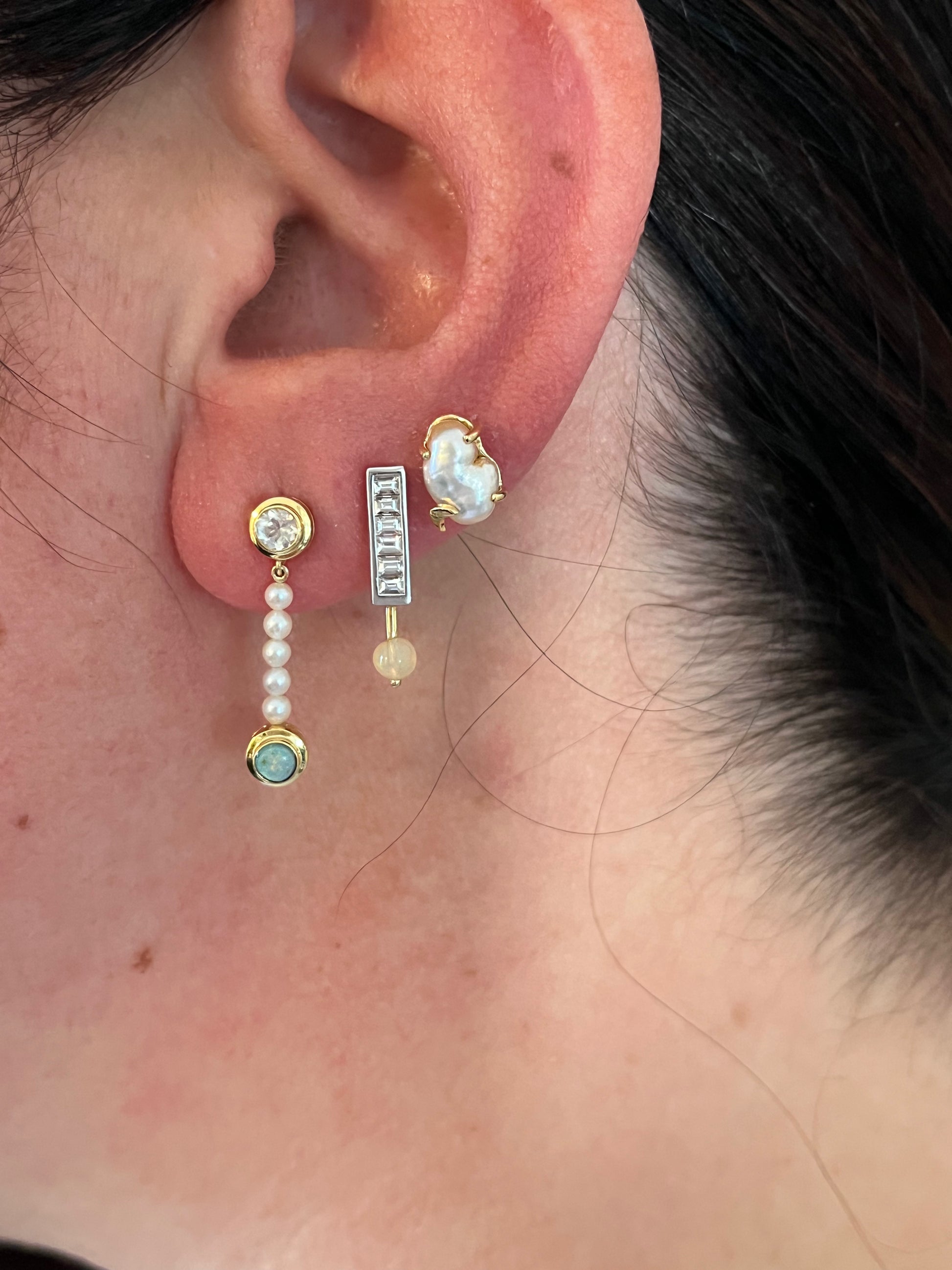 The Prim & Proper Earrings showcase playful sophistication through their charming mismatched opal and moonstone design. These 18k gold pearl drop earrings feature bezel-set opals and moonstones (.86 cts) paired with delicate pearl accents, creating ladylike elegance with whimsical appeal.