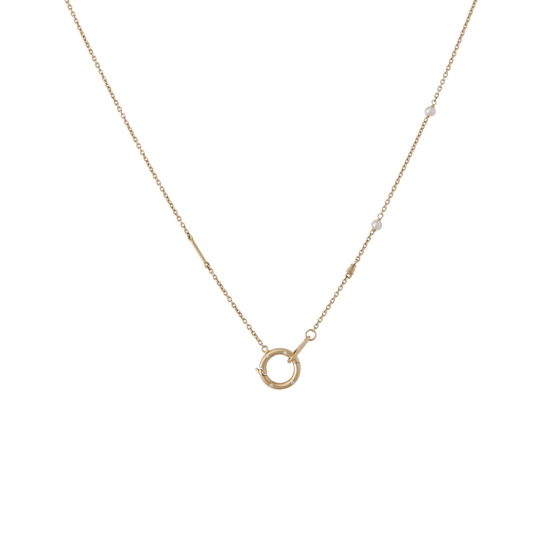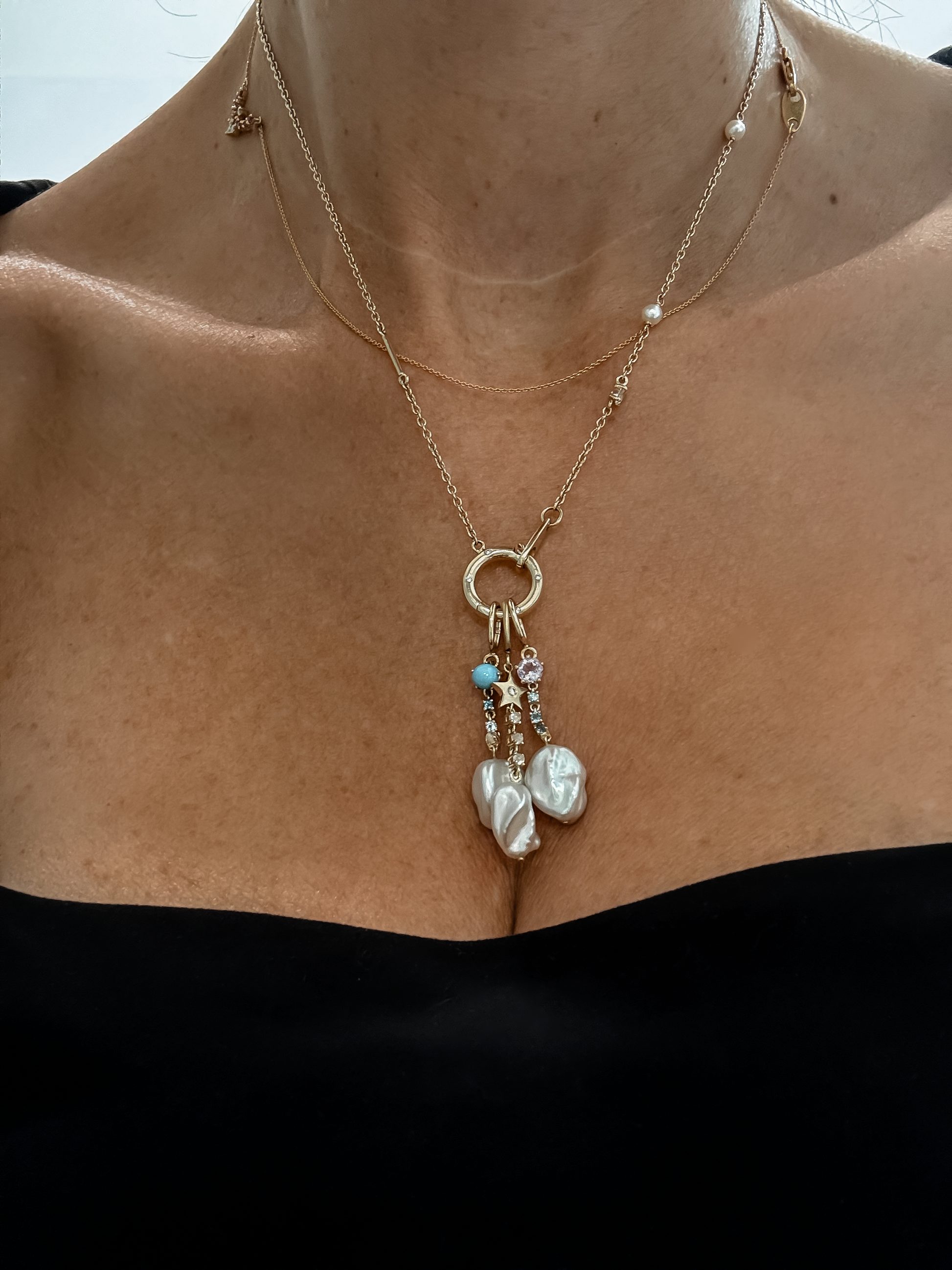 Lost in beautiful thoughts with UNHADA's Reverie Charm Chain, where daydreams take physical form in precious metals and gemstones. This enchanting piece features sparkling diamonds, brilliant white sapphire, and lustrous pearls dancing along gold chain, creating movement that fluid and graceful as your own imagination.