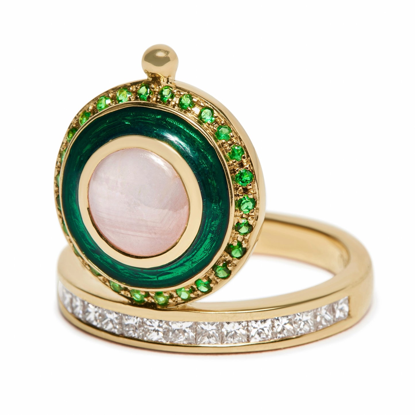 The one-of-a-kind Rise Ring showcases sophisticated artistry through its 18k gold star sapphire and tsavorite design. This exclusive statement ring features a cantilevered star sapphire (.19 cts) glowing against deep green enamel, framed by vibrant tsavorite garnets (1.31 cts) and channel-set diamonds (.45 cts) for brilliant luxury.