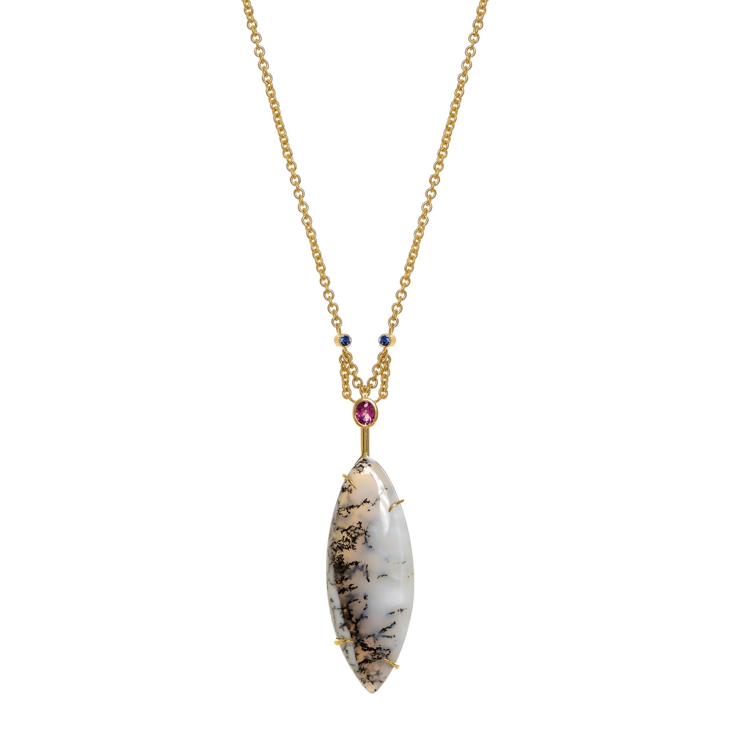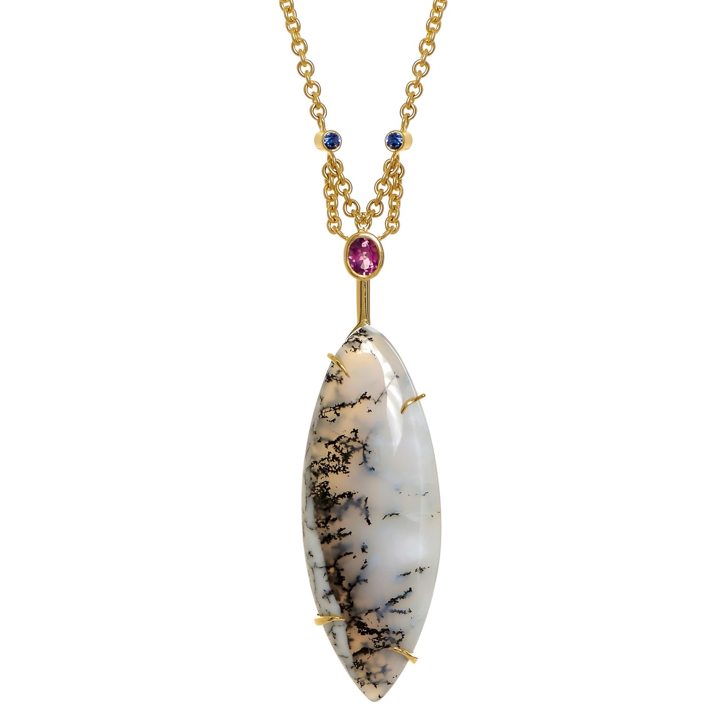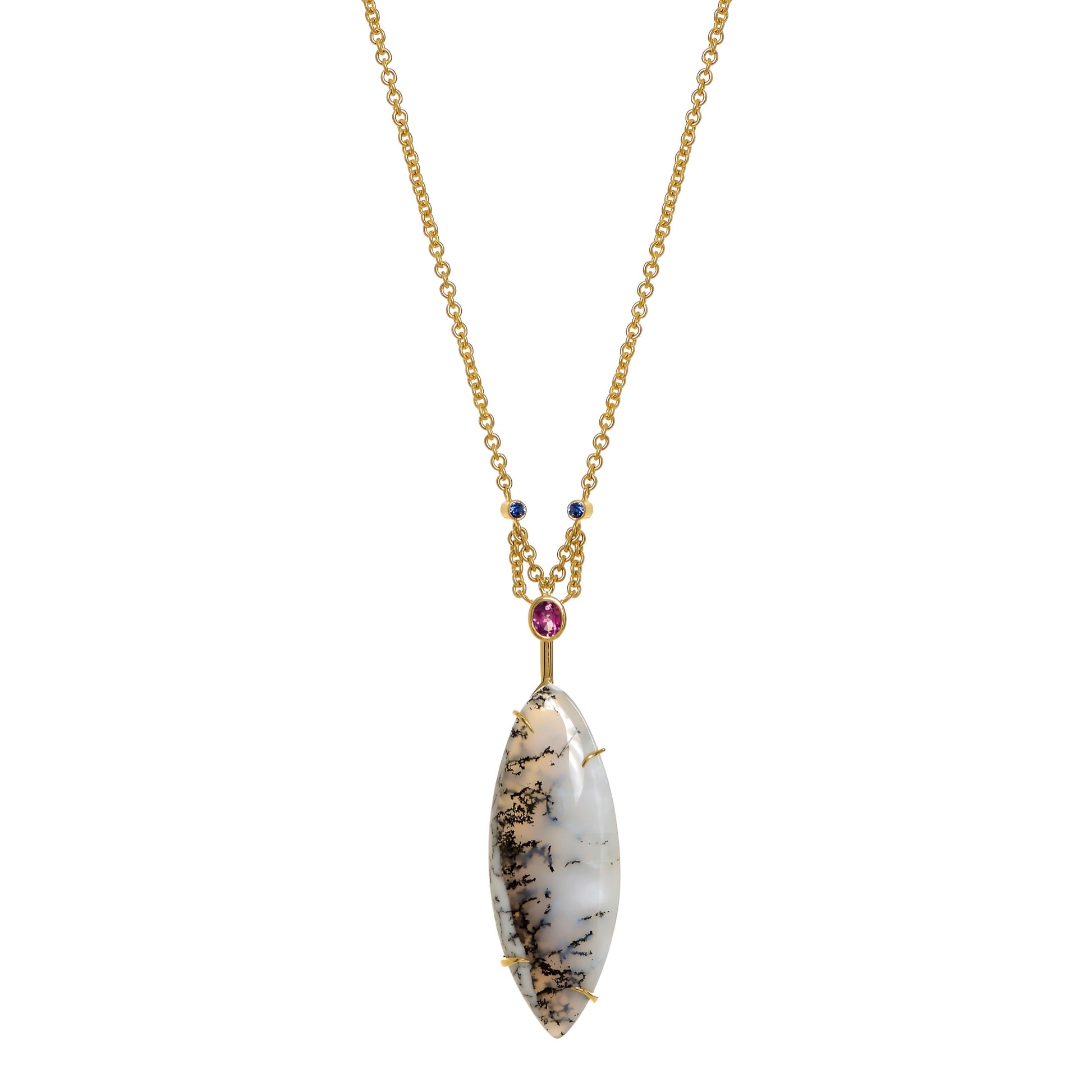 A tribute to nature's artistry, this Siberian Dynasty Necklace features a marquise-cut snow-white dendritic opal, its intricate patterns like frozen ferns captured in ice. Prong-set in 18k gold, the pendant is accented with sapphires and rare Morogoro spinel from Burma, adding a touch of ethereal color.