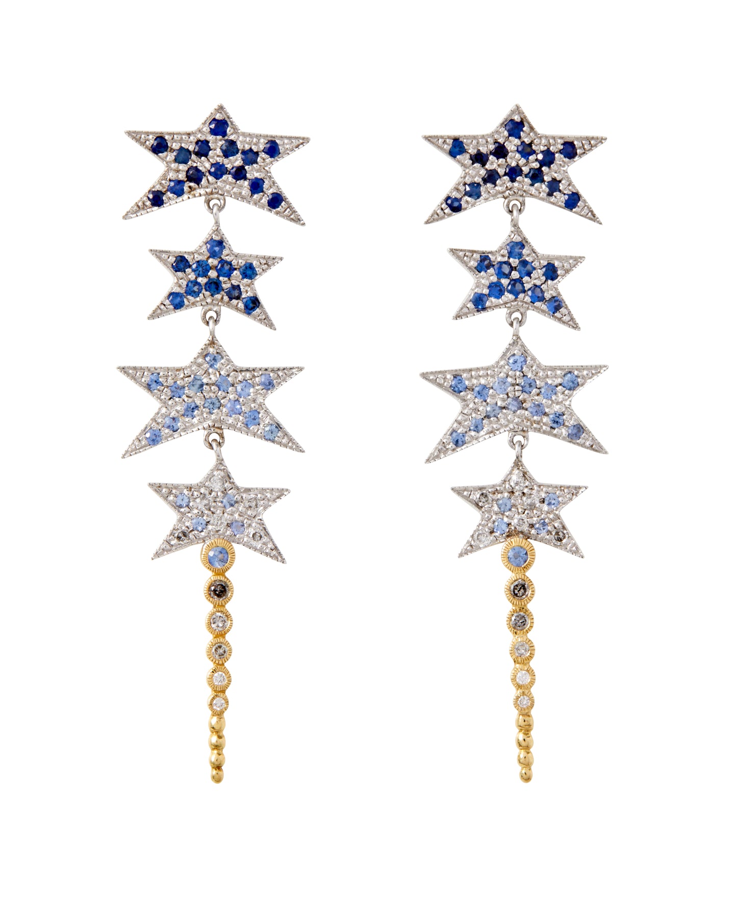 Starplay Earrings invite you to reach for the stars with their bold linear statement design featuring cascading stylized stars in sterling silver and 18k gold. These ombre blue sapphire earrings showcase sterling silver stars adorned with shimmering ombre blue sapphires (1.06 cts) and graduated bezel-set sapphires and diamonds (.23 cts) in radiant 18k yellow gold.