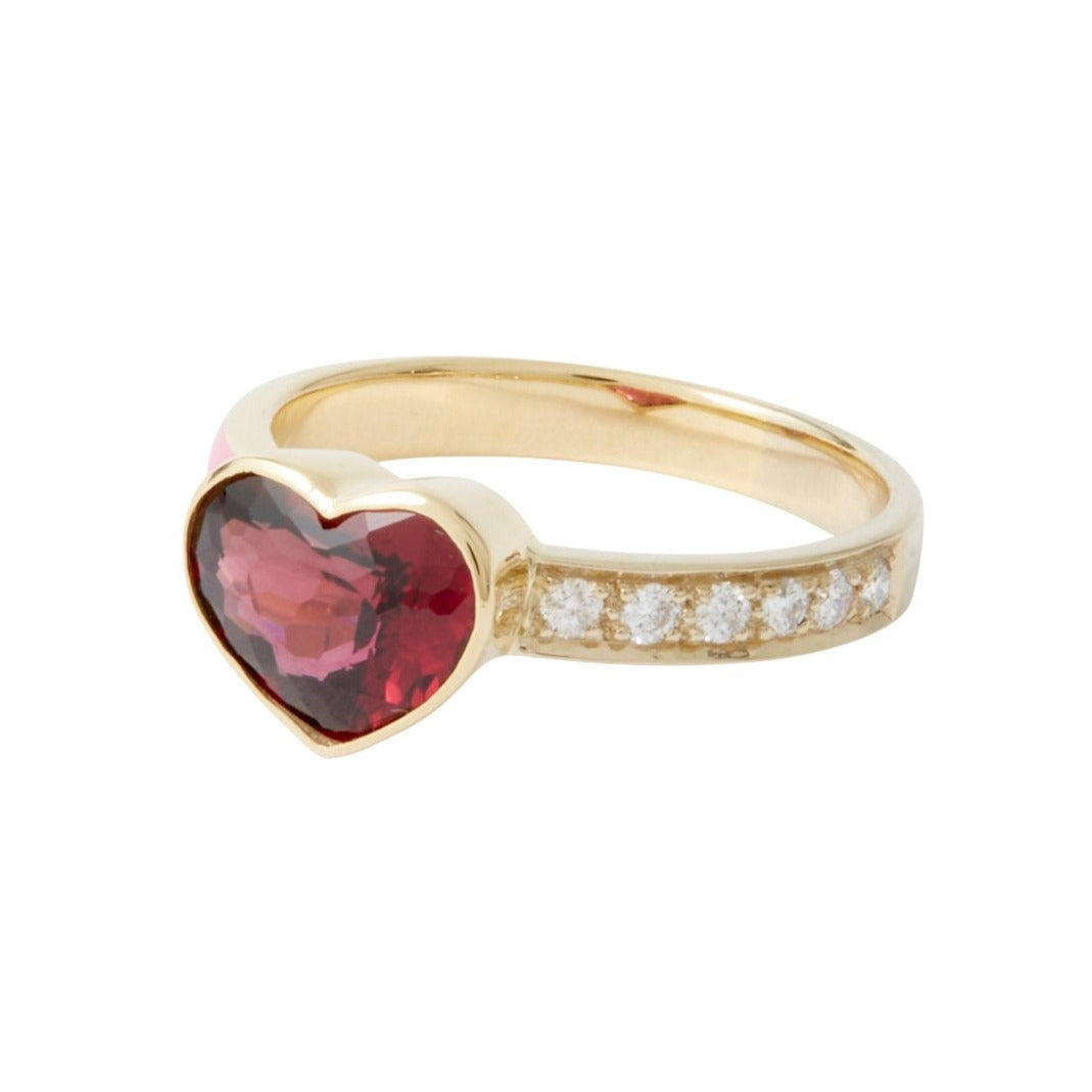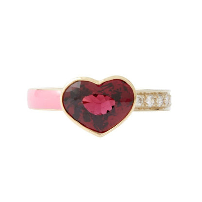 The Garnet Heart Tea Party Band serves as a love letter in gemstone form, featuring a rich 2.76 ct garnet heart taking center stage with deep crimson hue glowing against a delicate pink enamel band adorned with diamonds. This one-of-a-kind heart garnet ring in warm 18k gold delivers undeniably romantic elegance.
