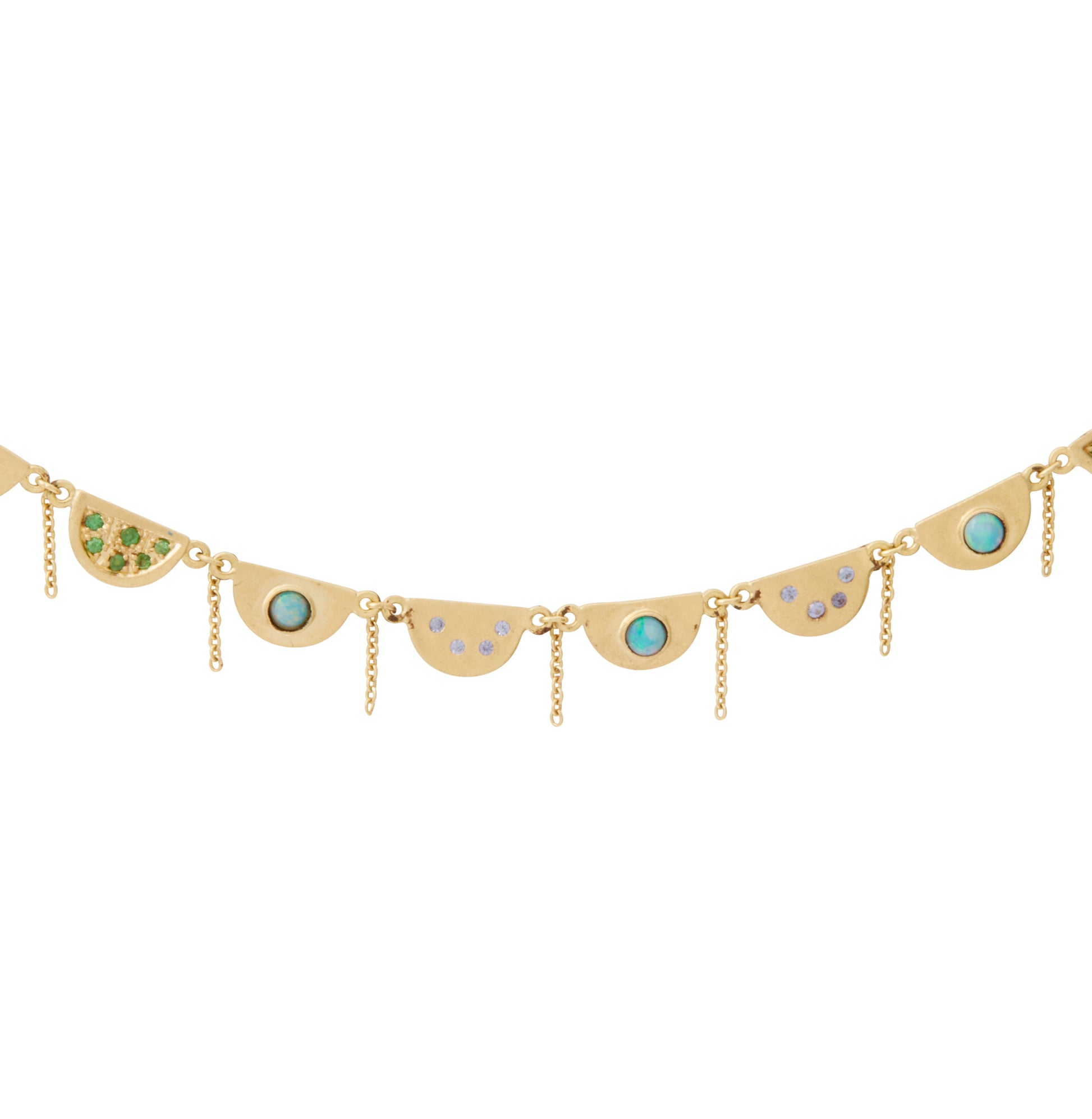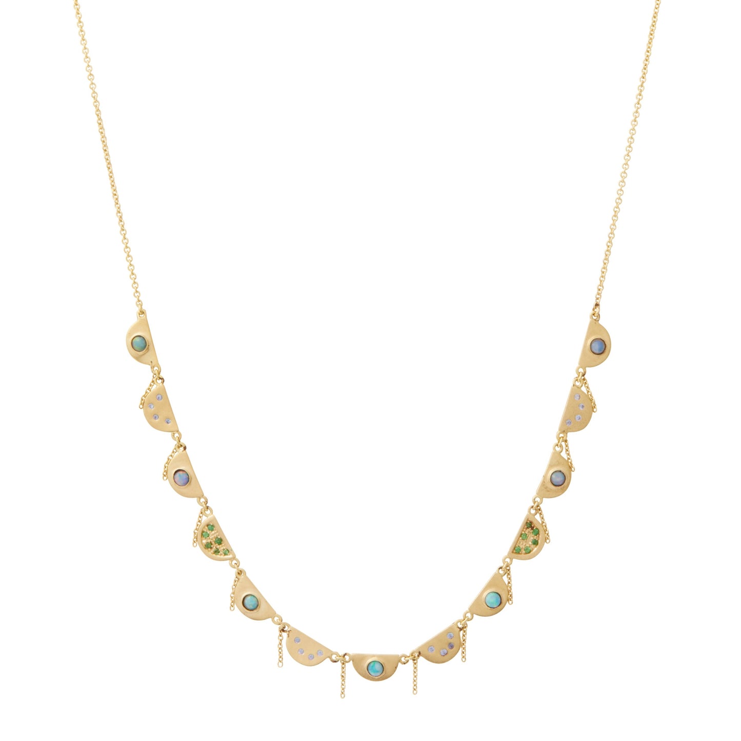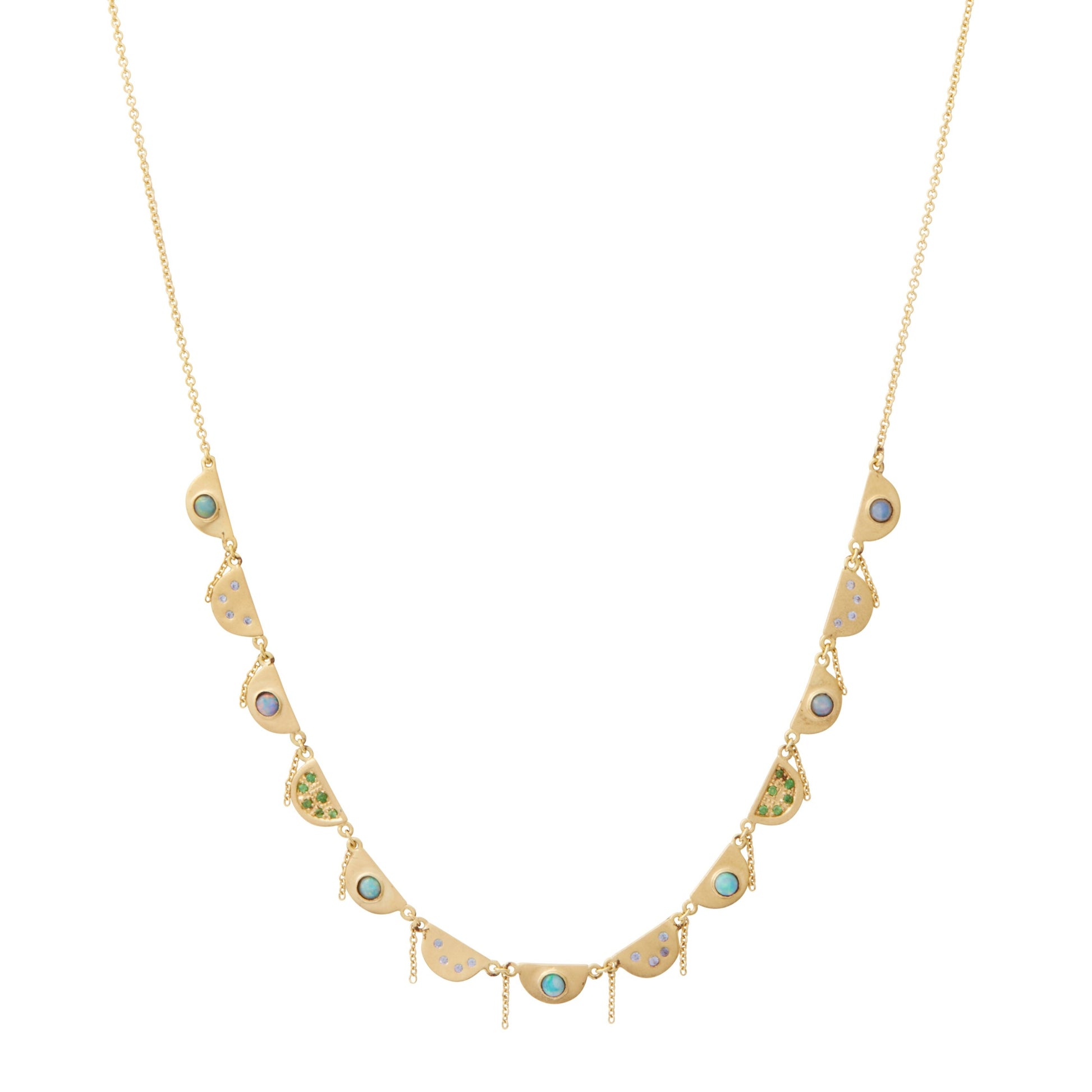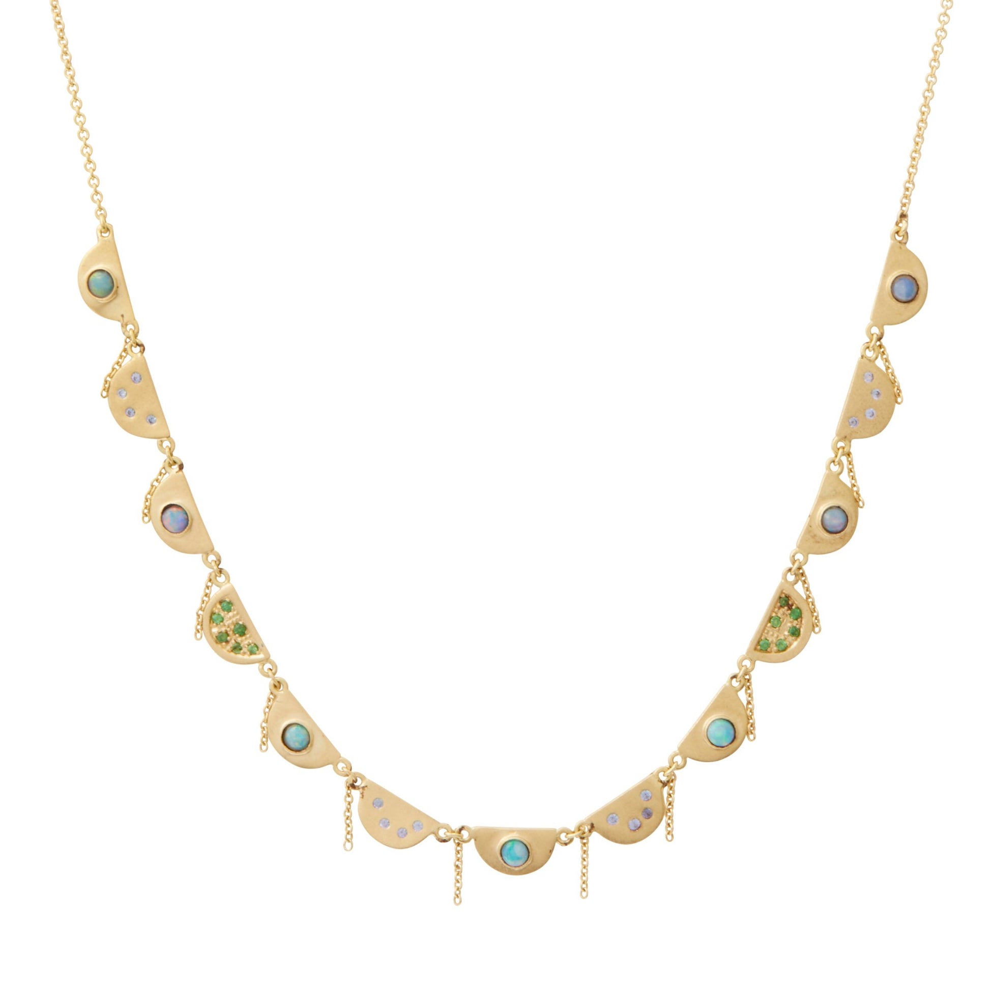 Discover the Chantal Necklace, a stunning 18k gold multi-gemstone necklace featuring an elegant scalloped design inspired by fine china. This adjustable gold necklace (16-18") showcases tsavorite (.09 cts), opals, and sapphires (.10 cts), creating sophisticated charm perfect for any occasion.